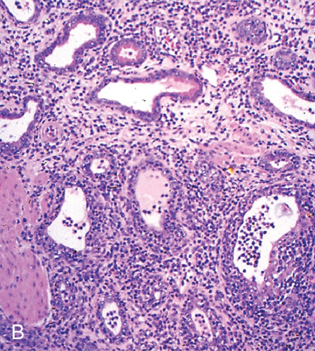 - Hyperplasia and papillary proliferation of the glandular tissue