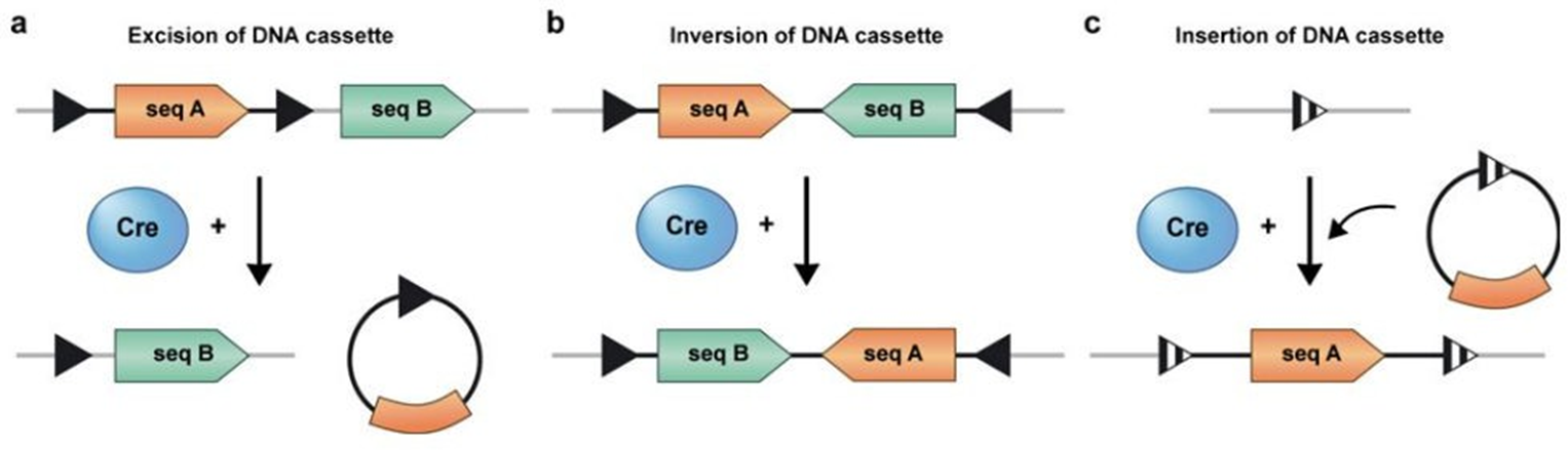 Drie zaken die kunnen gebeuren op LoxP sites, door Cre
