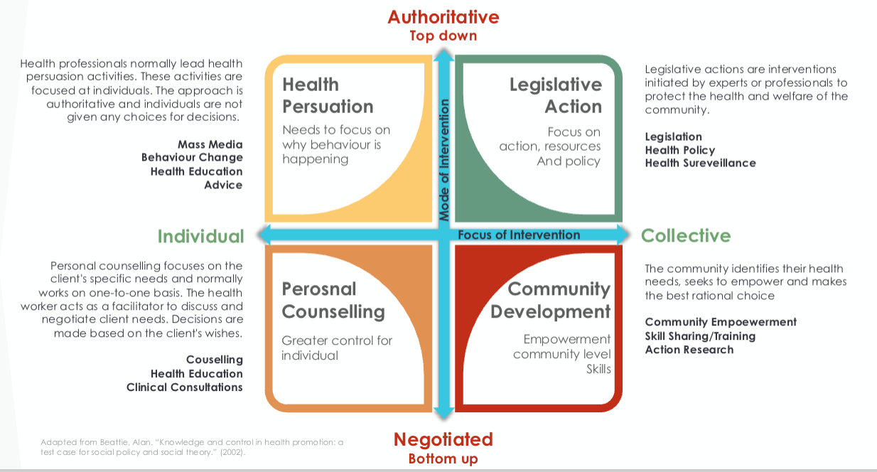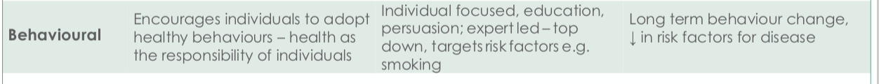 In order to address health issues, a wider range of health promotion approaches should be used that directly addresses the wider upstream determinants.