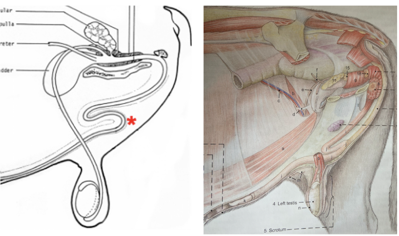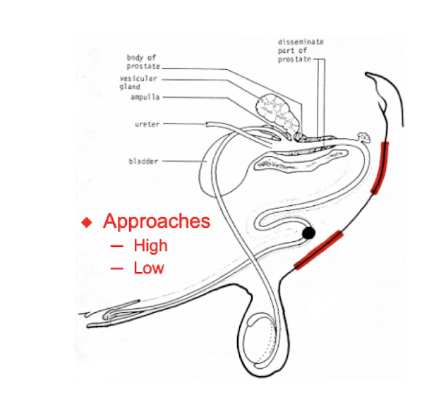 Low = caudal to scrotum