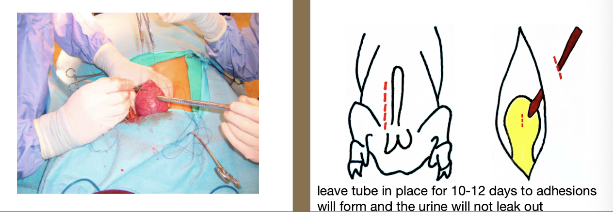 Ideally surgically repaired → caudal paramedian inscision indwelling urinary catheter → aids healing then decompressed via catheter