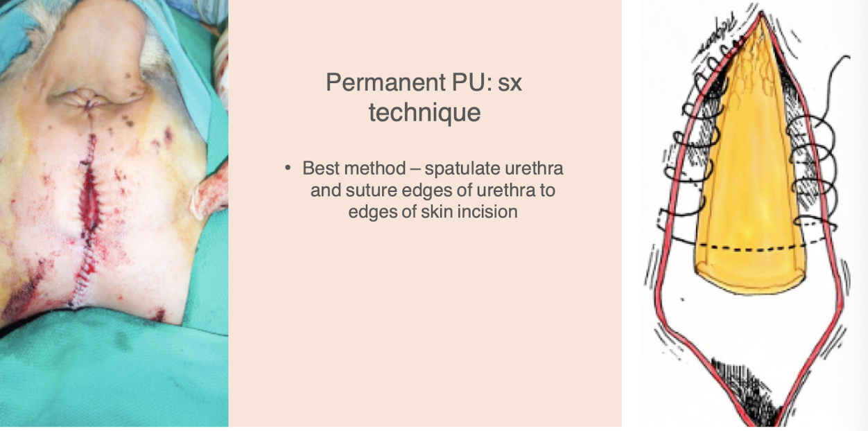 Pet goat/sheep: Can consider temporary or permanent urine exit depending on recurrence or stone accessibility