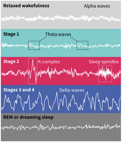 stage 2 and early stage 3: also see special waveforms of K complexes and sleep spindles (supressing incoming sensory information, as well as learning and memory)