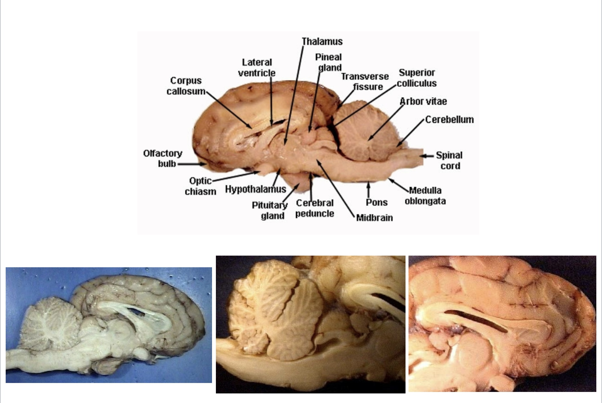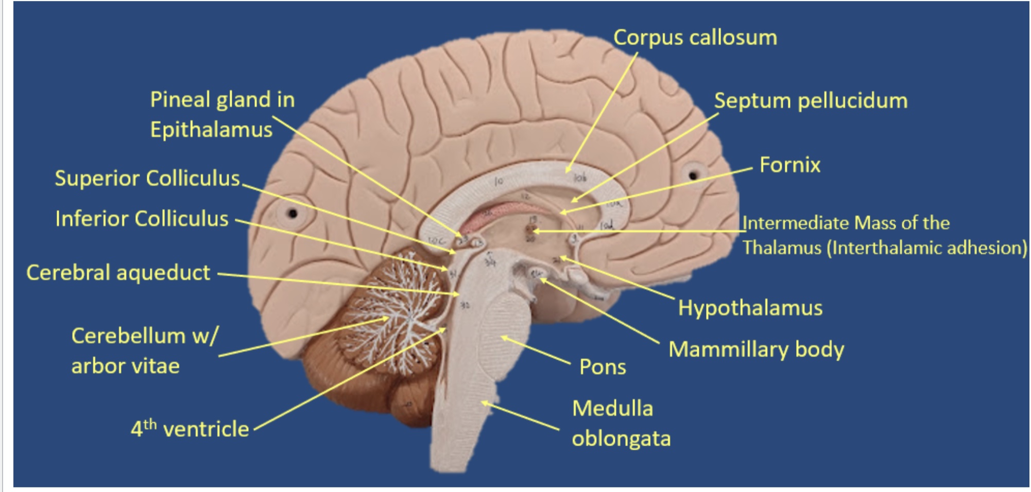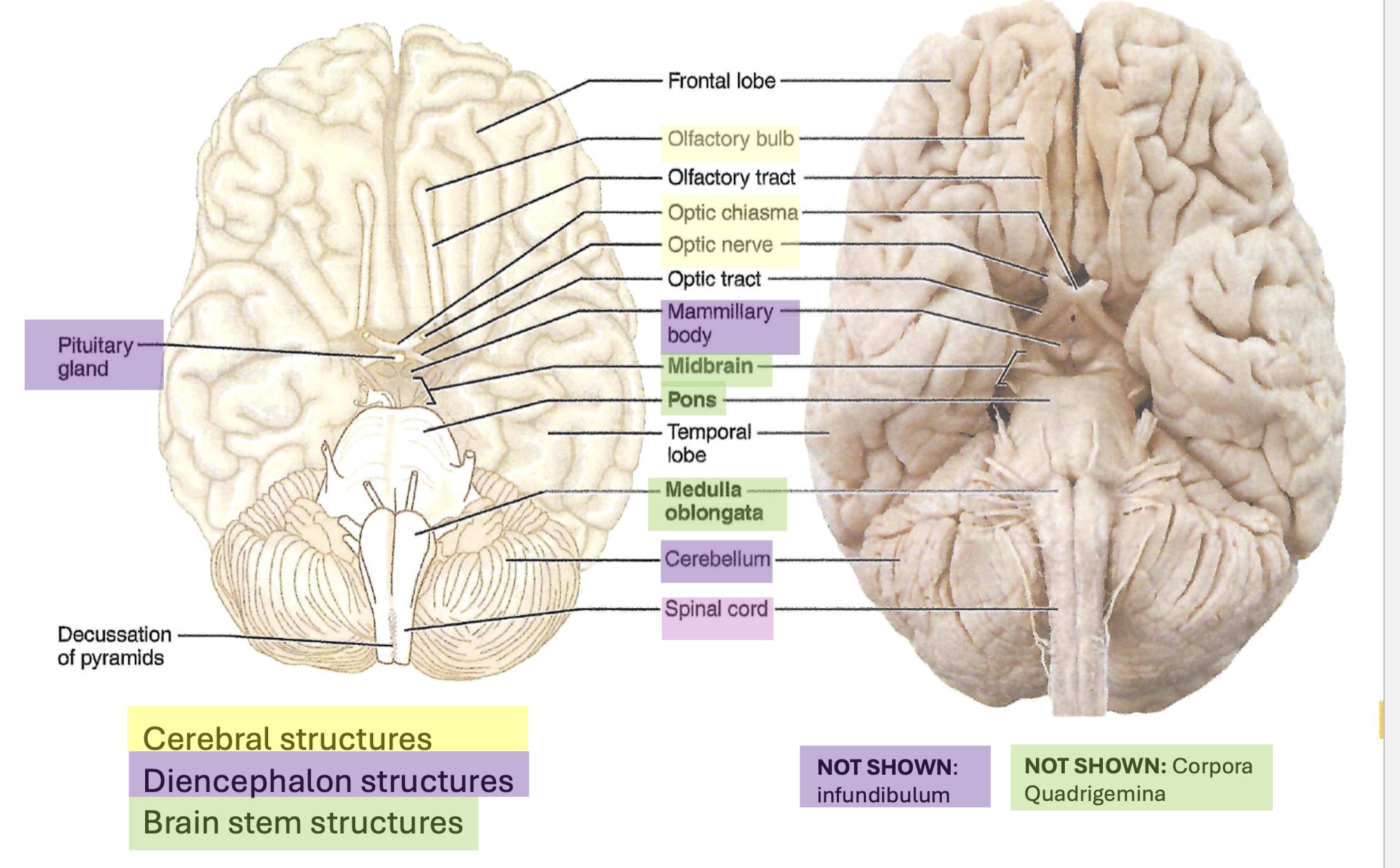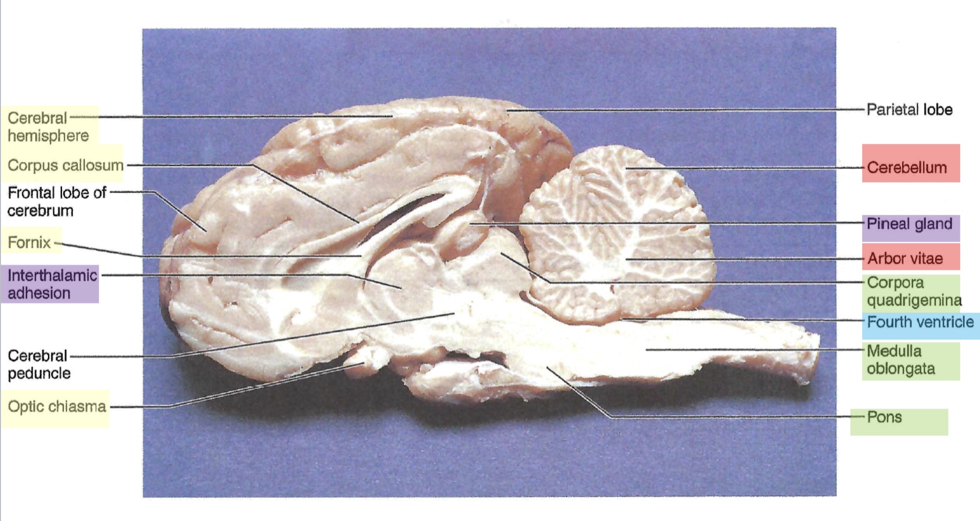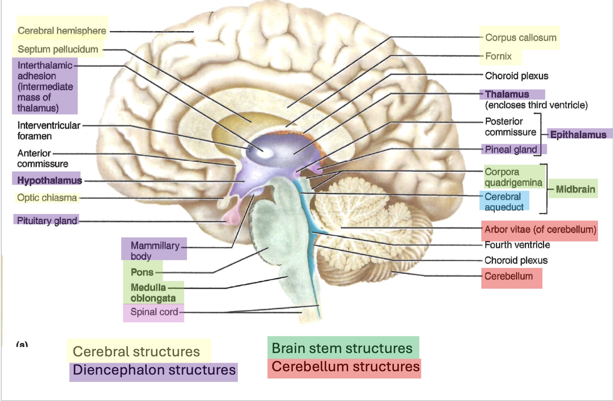 Enclosed by cerebral hemispheres; superior to brain stem; composed of three paired structures— thalamus, hypothalamus, epithalamus