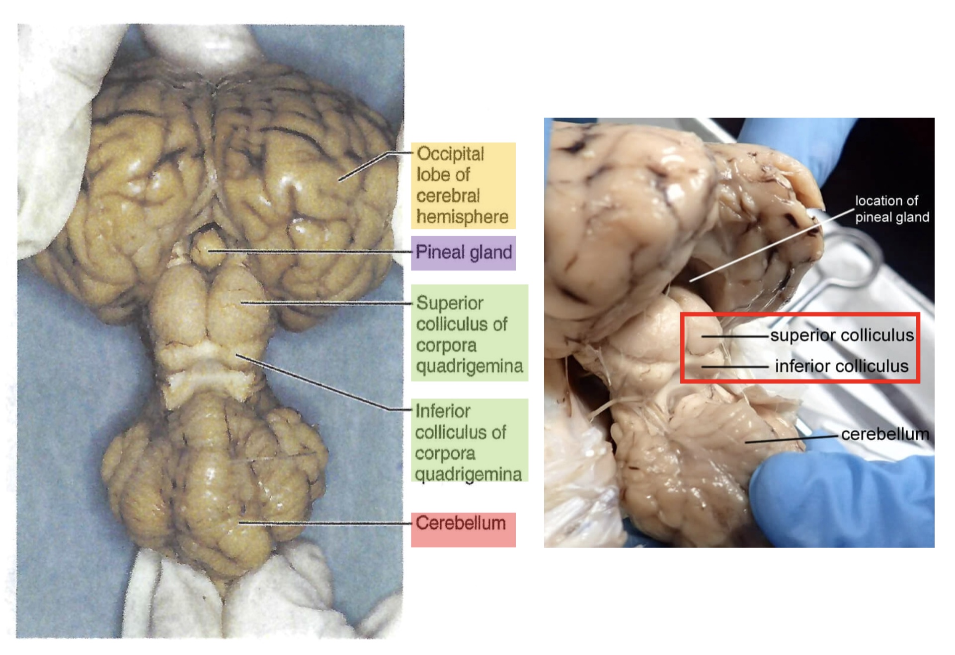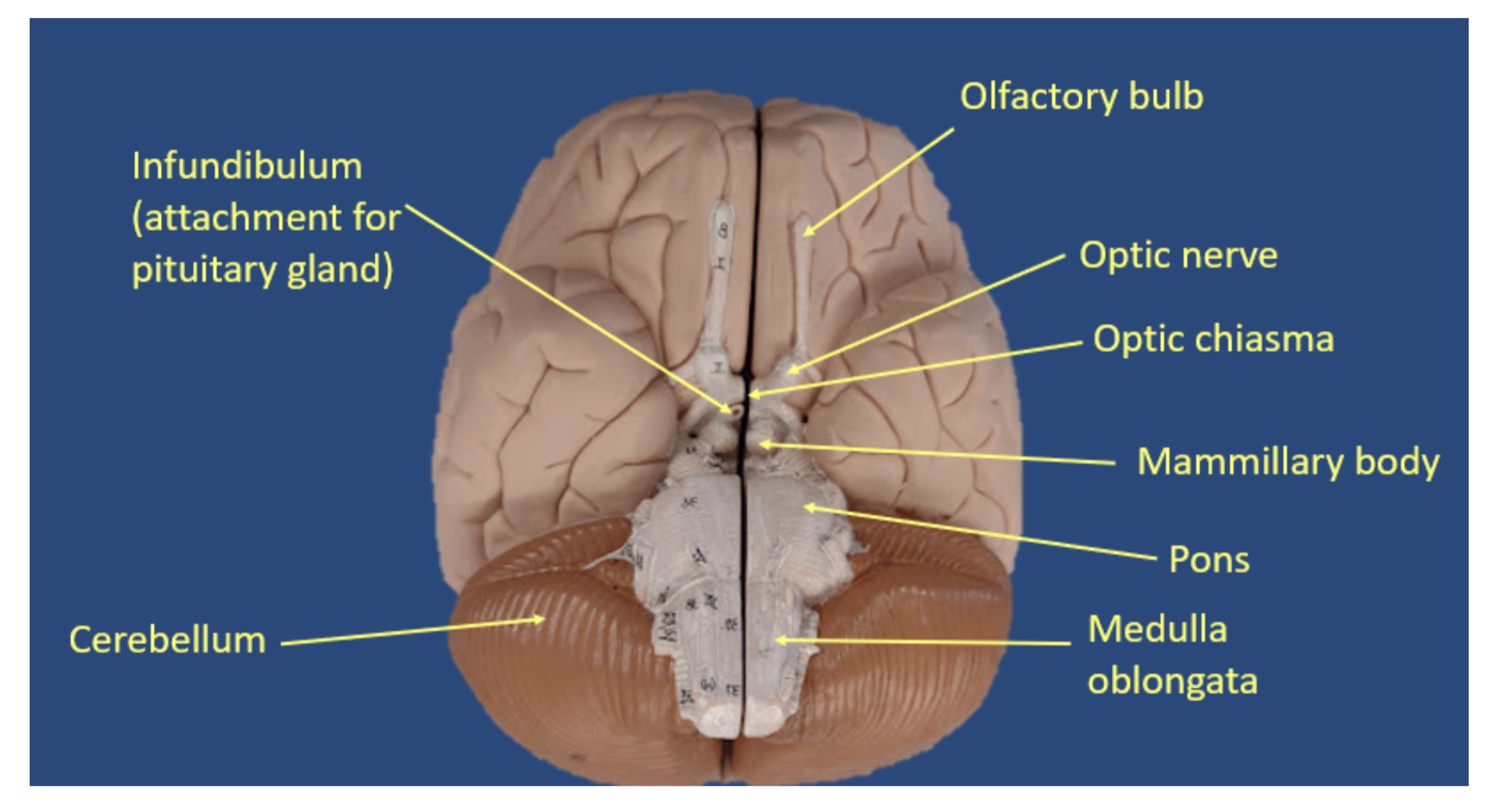 Most inferior brain region; continuous with spinal cord; controls body functions necessary for survival; three regions— midbrain, pons, medulla oblongata