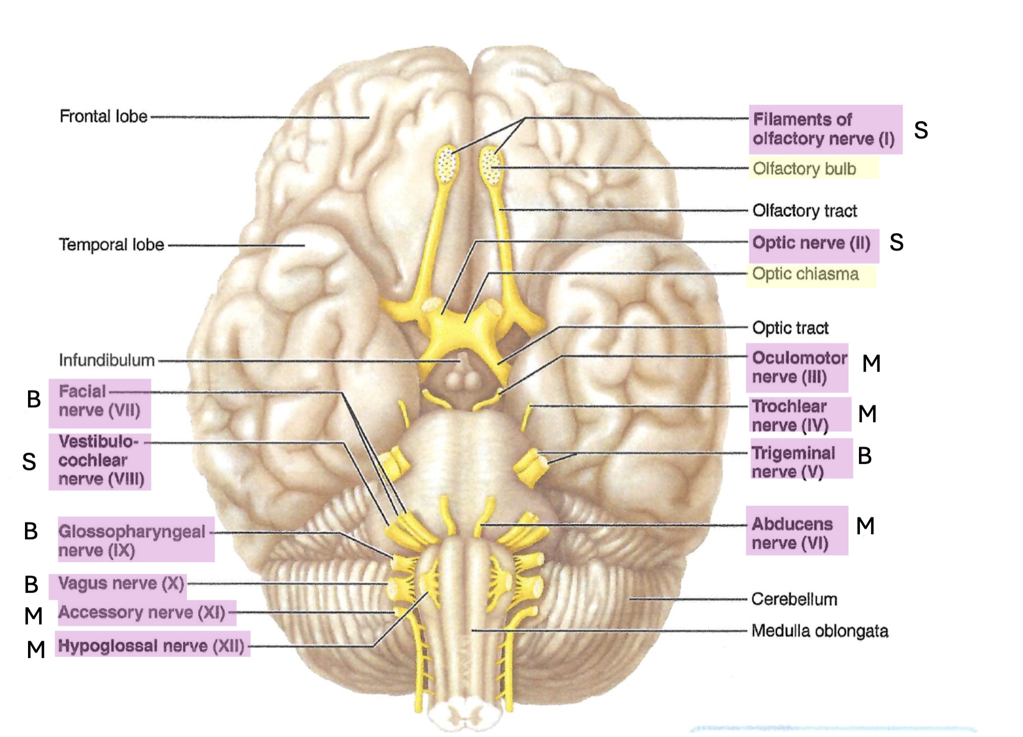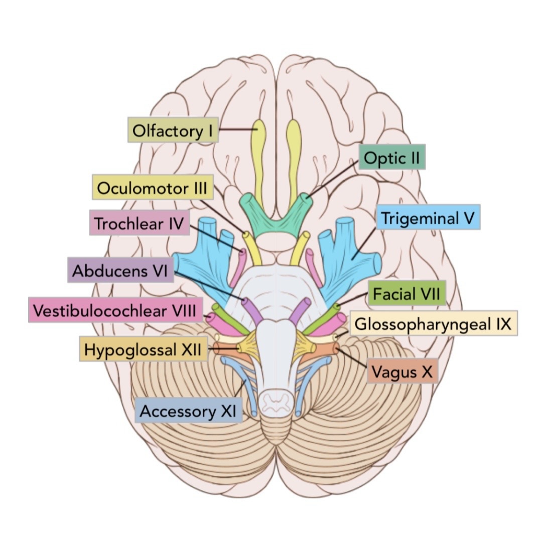 XII, motor, swallowing and speech, tested by sticking out tongue and seeing if its straight or deviated