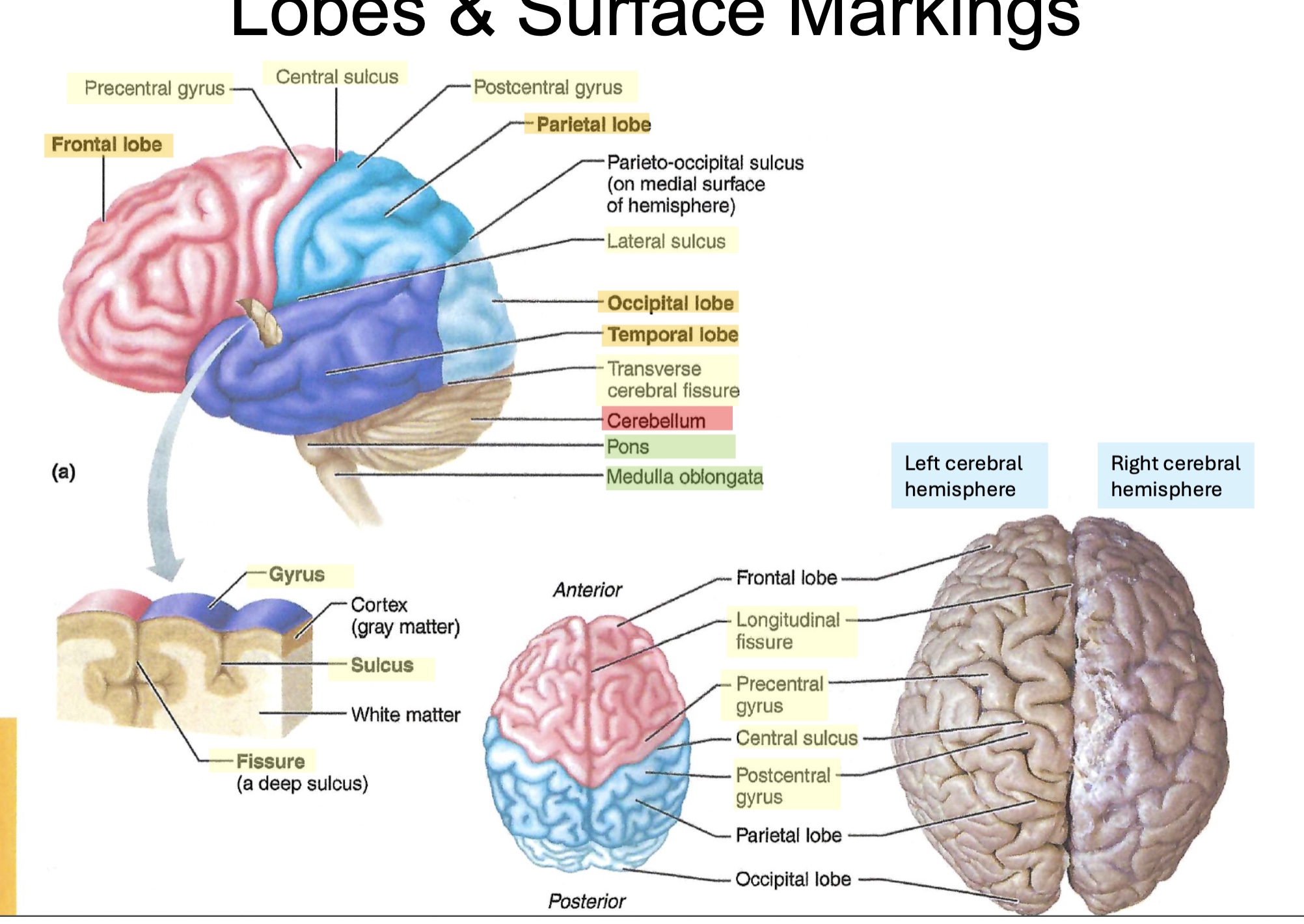 Separates frontal and parietal lobes; precentral and postcentral gyrus