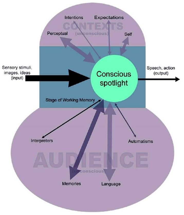 coulissen & publiek = onbewuste processen (sensorische input, concept of self, intenties/doelen, herinneringen, taal/grammatica, automatische gedragingen (zoals wanneer je leest, auto rijd, fiets, allerlei breinprocessen op de achtergrond werkende)