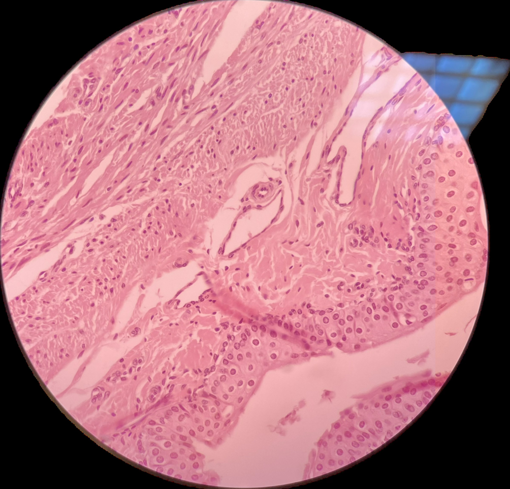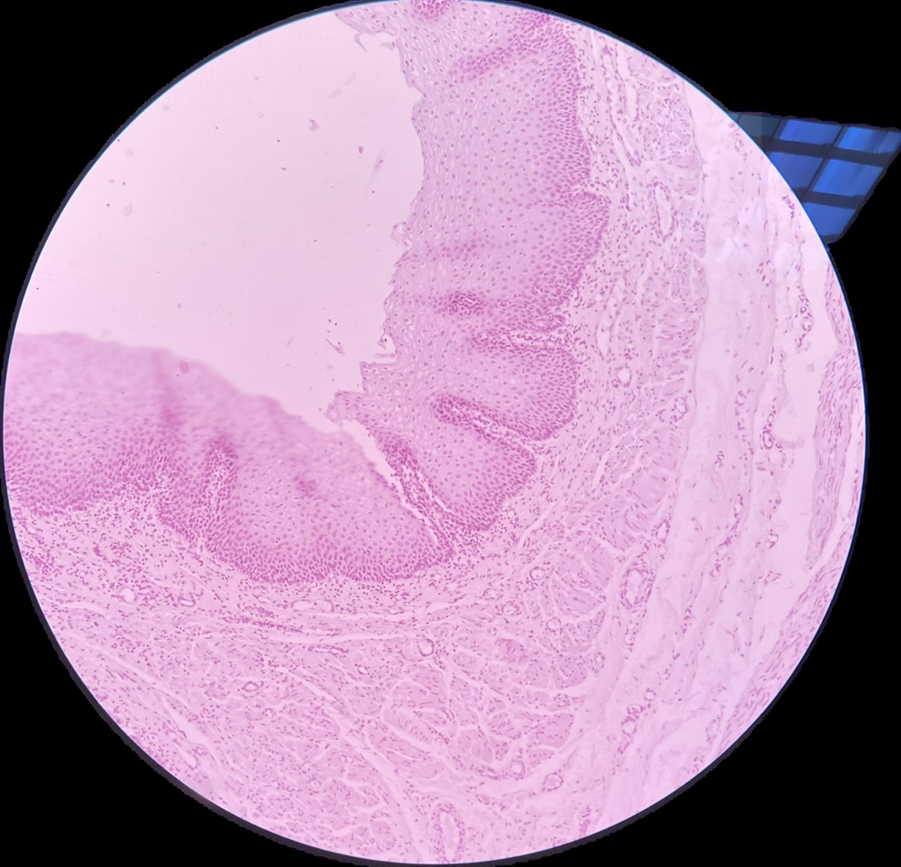 Stratified non-keratinized squamous epithelium from esophagus (H&E) contains, superficiale, pricle, basal and connective layer