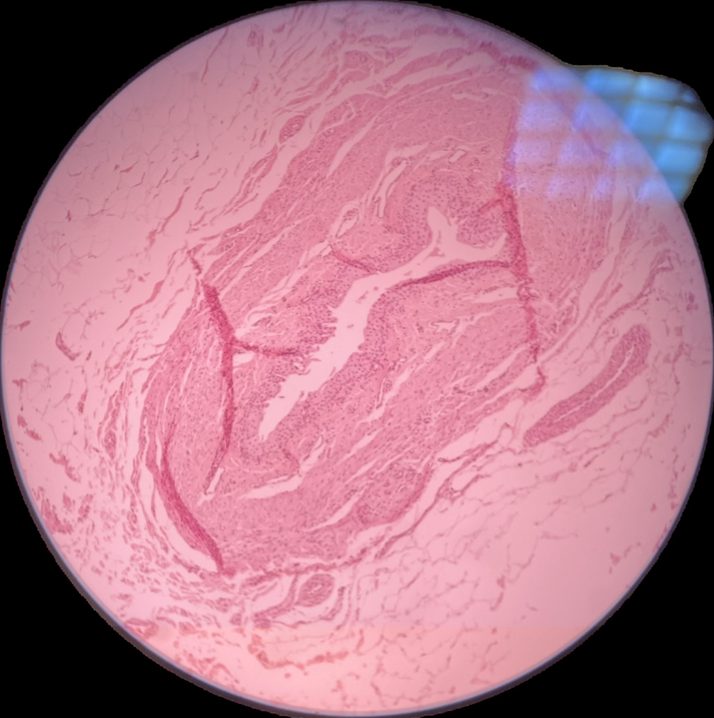Cross-section through a large peripheral nerve (Azan), blood vessel, fasccle, adipose tissue perineurium and epinerurium
