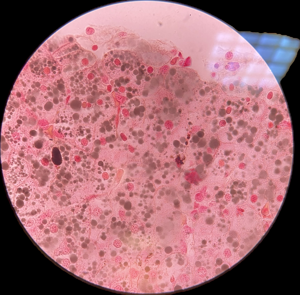 Lipids in liver cells of axolotl (Carmine+OsO4) contains: lipid cell drolets and liver nuclei