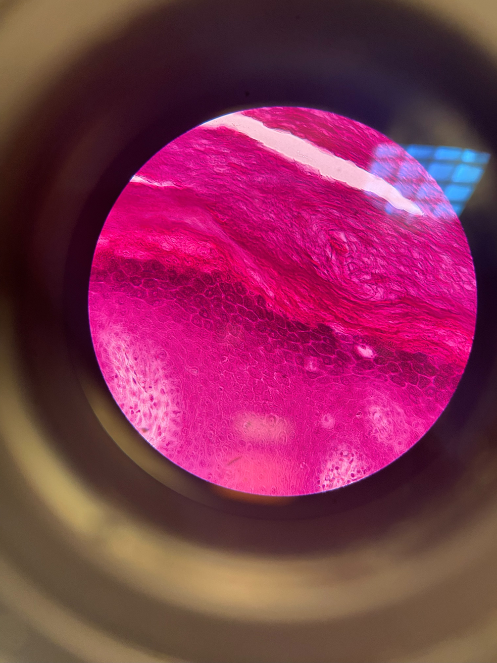 Protein granules in the skin of axolotl (H & E), Contains pgment cell in connective tissue, connective tissue and epitelium