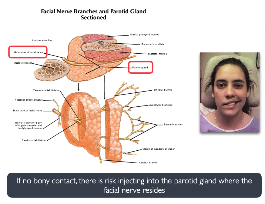 didn’t contact bone because injected too far posteriorly into parotid gland