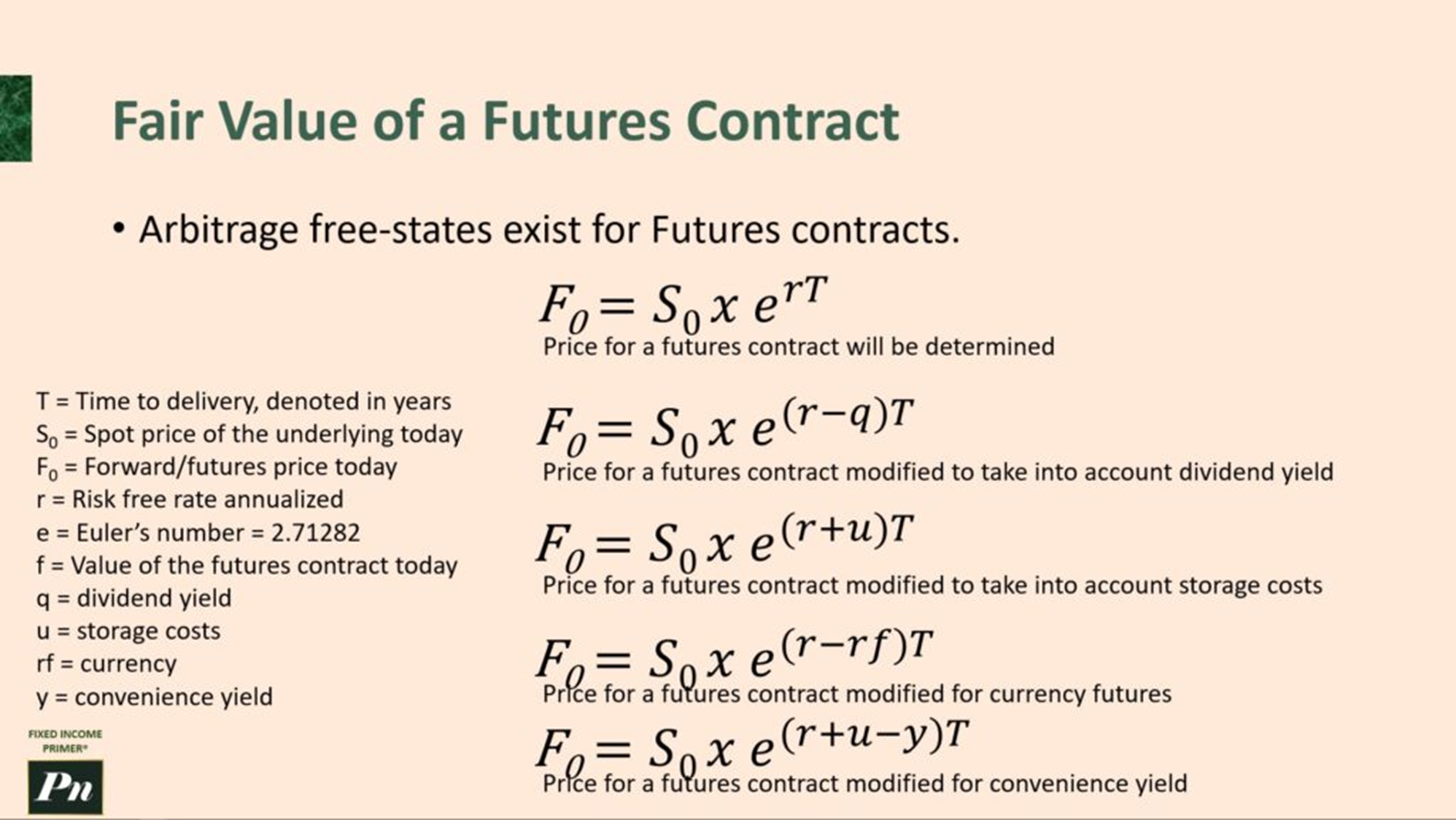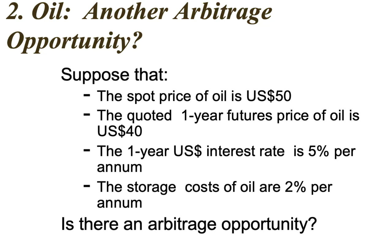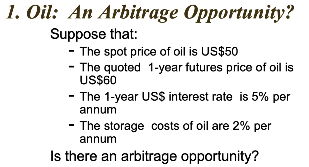 Fair forward price: F = S*e^((r+u)T) = $50*e^((0.05+0.02)x1) = $53.63
