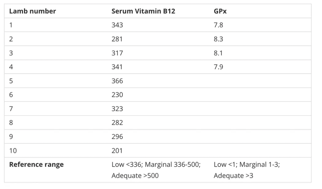 Co | Lambs | Pre-weaning or at weaning | Serum vitB12 | 10 |