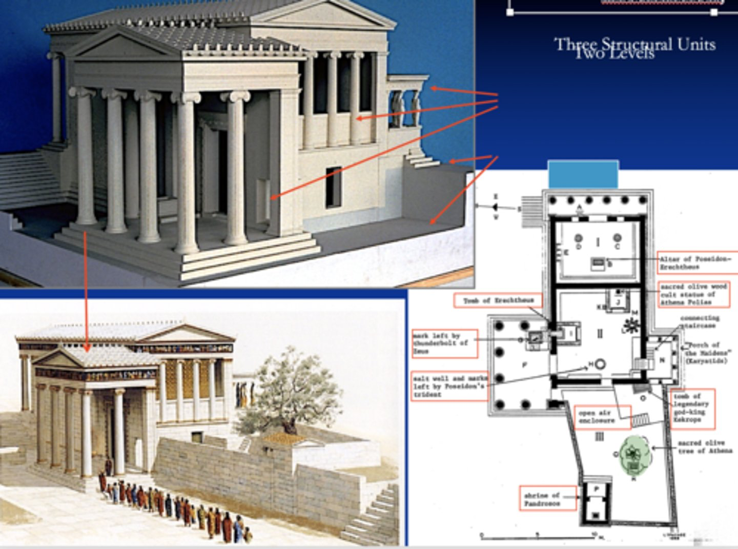 the Erechtheion was a composite of 3 structural units at 2 different levels, housing various gods, holy places, and sacred objects