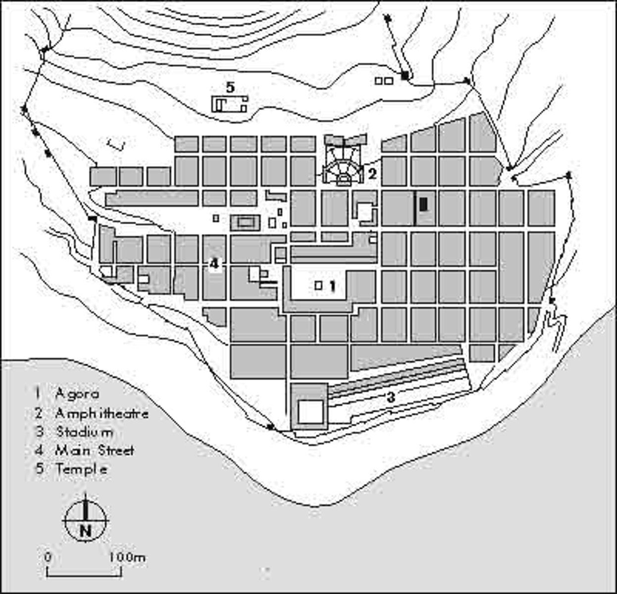 small city in Ionia rebuilt according to a "Hippodameian" system in the 4th century B.C.