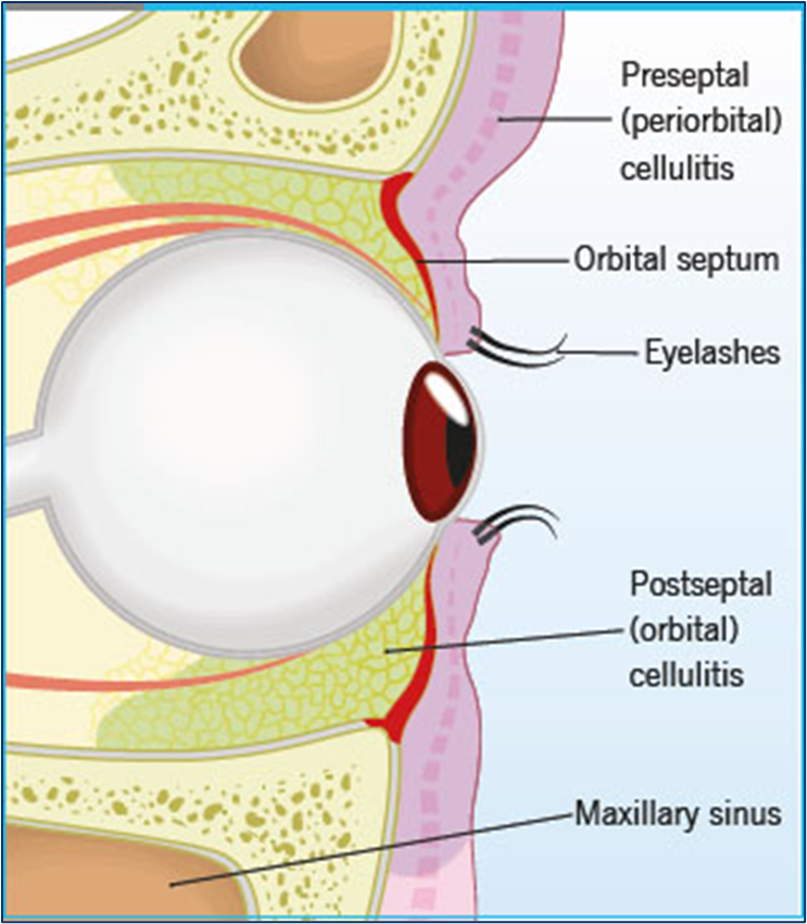difficult to clinically differentiate between preseptal or orbital - not job of optometrists to differentiate between them