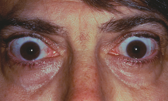Eyelid retraction - eyelid lag on downgaze - lagophthalmos (inability to close eyelids properly - exposure keratopathy)
