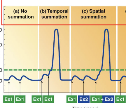 If an excitatory presynaptic input (Ex1) is stimulated a second time before the first EPSP in the postsynaptic cell has died off; the second EPSP will add onto or sum with the first EPSP; potentially bringing the postsynaptic cell to threshol