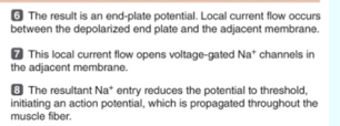 The EPP causes current to flow between the depolarized end plate and the adjacent resting cell membrane; this flow causes the opening of voltage-gated Na+ channels; reducing the potential to threshold in adjacent areas; leading to a subsequent AP that propagates throughout the muscle fiber by contiguous conduction