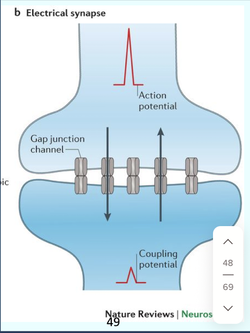 Two neurons connected by gap junctions; allowing charge-carrying ions to flow directly between cells in either direction (bidirectional); resulting in unbroken; extremely rapid; unregulated transmission; an action potential in one neuron always leads to an action potential in the connected neuron
