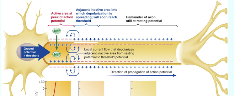 Local current flows from the active area (at the peak of the AP) to the adjacent inactive area; depolarizing it from resting potential to threshold potentia