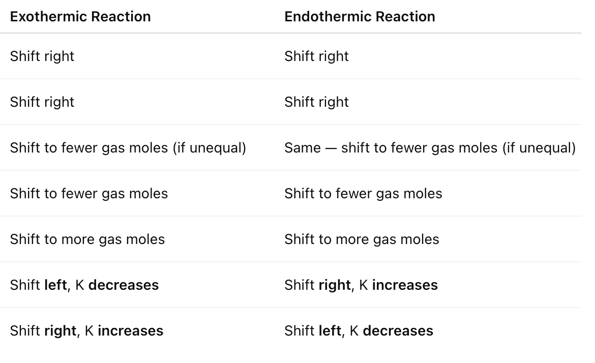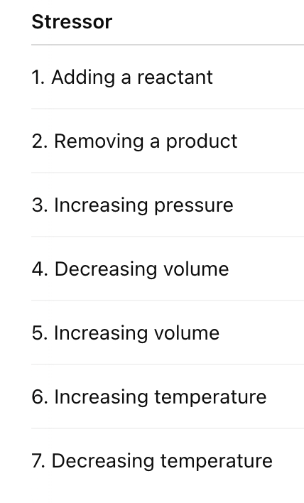 When a reaction at equilibrium is stressed (changed somehow) the reaction responds to relieve the stress and return the reaction back to equilibrium. The typical stresses include: