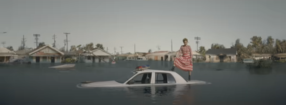 Shows Beyonce against the backdrop of the devastation of Hurricane Katrina