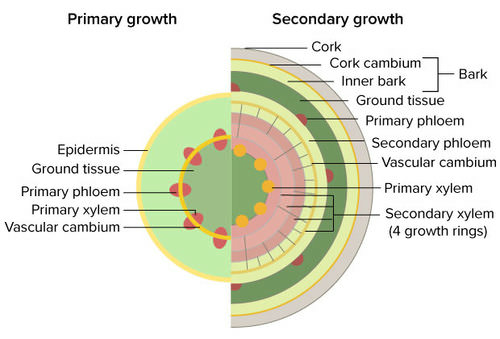 vessels, tracheids and fibres all become lignified and loose their cell contents. The parenchyma stays living