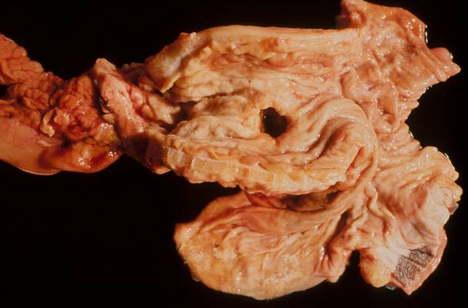 Adenocarcinoma —> thickened hole of stomach wall