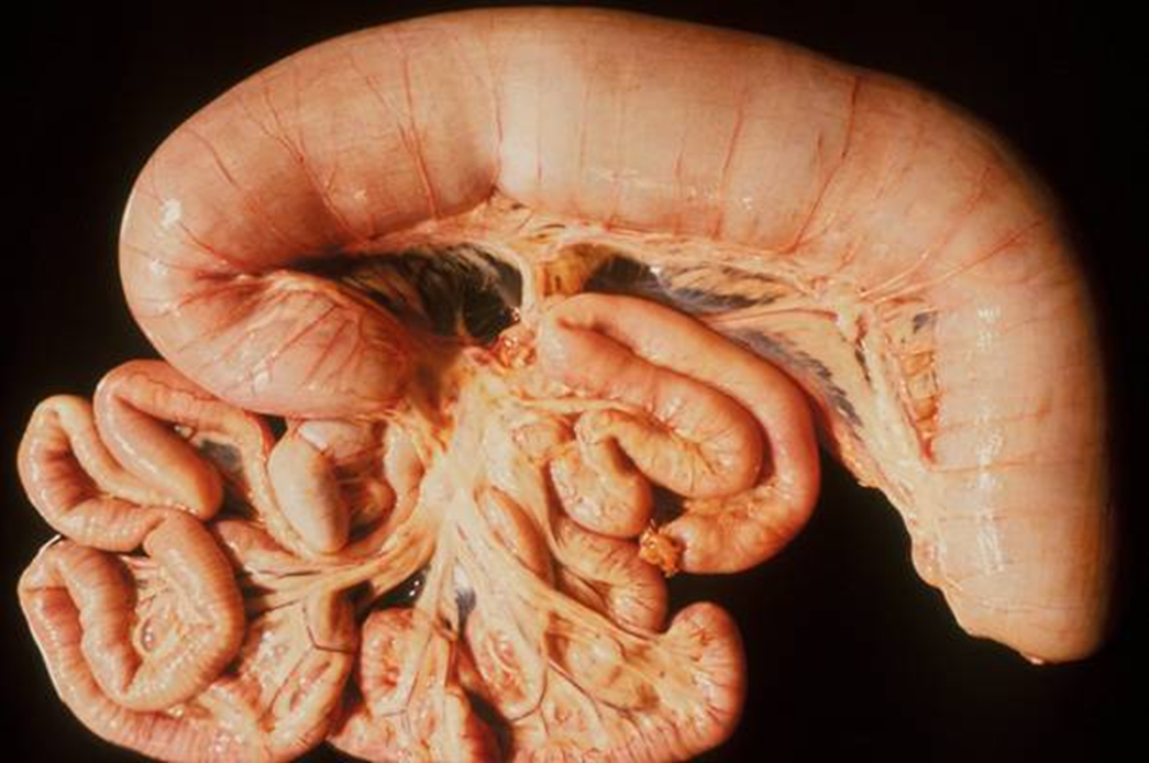 find a portion of mesenteric vessels being haemorrhagic —> cause of death