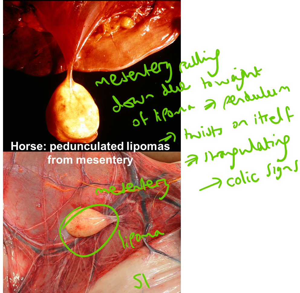 Horse —> volvulus of pedunculated lipoma around right colon