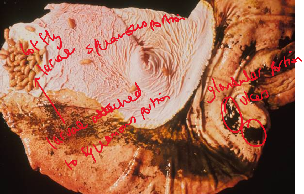 induce erosions (and chronic hyperplastic gastritis), but no apparent association betweenbot infestation and development of gastric ulcers