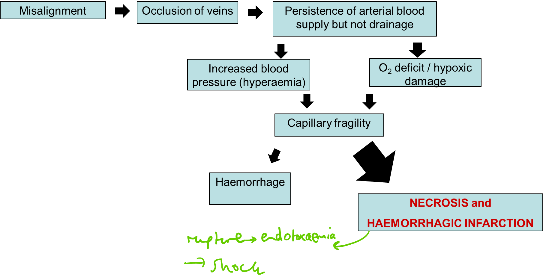 Closes venous return (arterial blood still pumping) → necrotic + devitalosed → ischamia (endotoxins in bloodstream)
