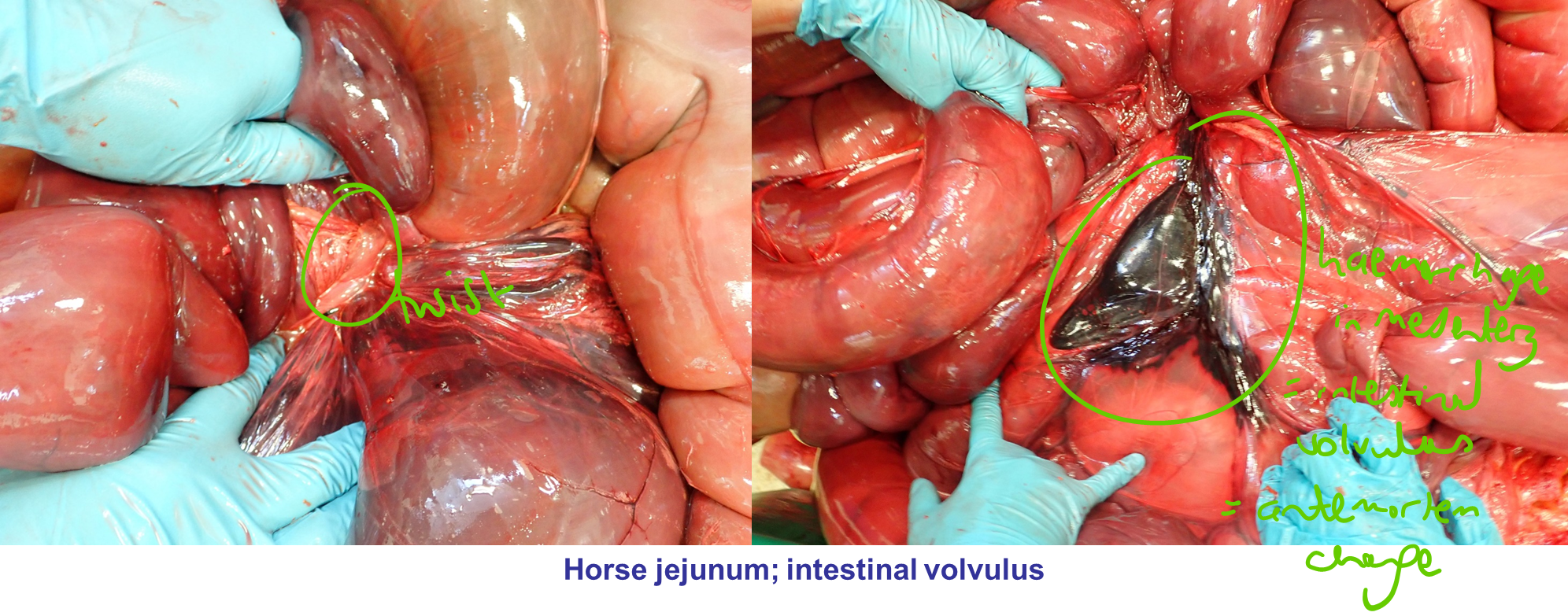 how to tell if an intestinal volvulus has happened before (i.e the cause) or after death?