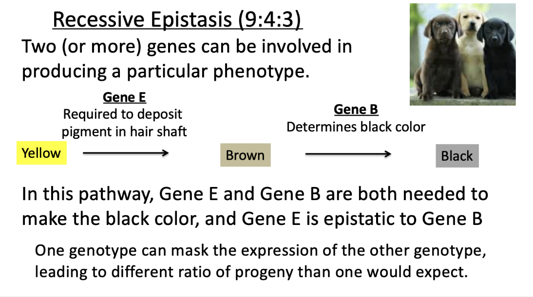 LO 17.1 Describe the phenomenon of epistasis and interpret the results of crosses involving genes working in a pathway. Given a set of genes that are known to interact in a pathway, determine the “epistatic” relationship between the genes. Predict phenotypes of offspring of crosses involving two genes, given information about biochemical pathways or functions of the genes.