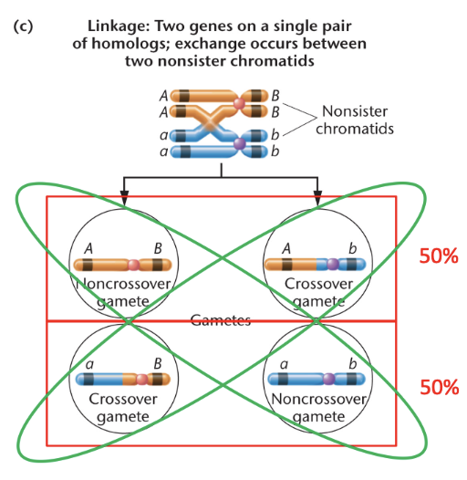 LO 18.1 Explain how homologous recombination during meiosis leads to new combinations of alleles in gametes, at different proportions than with unlinked genes.