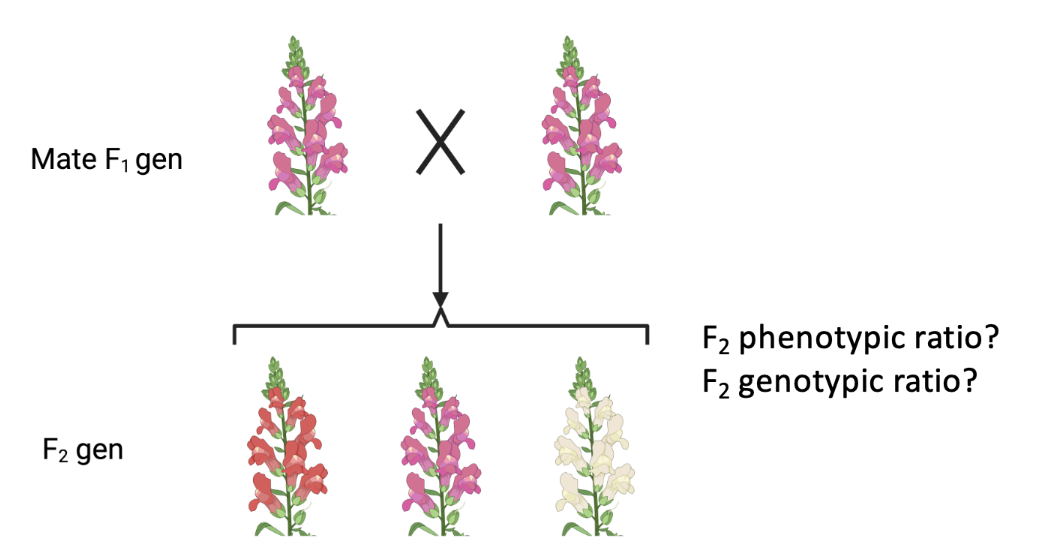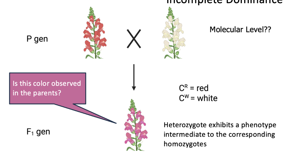 A red-flowered plant (RR) crossed with a white-flowered plant (WW) produces pink flowers (RW).