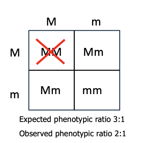 expect phenotype is 3:1 but due to lethal allele types the observed phenotypic ratio is only 2:1