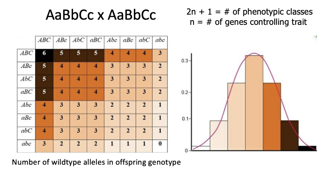 LO 16.2 Using an additive model of allele contributions to a trait, determine the phenotypes of individuals who have varying numbers of dominant alleles for a polygenic trait.
