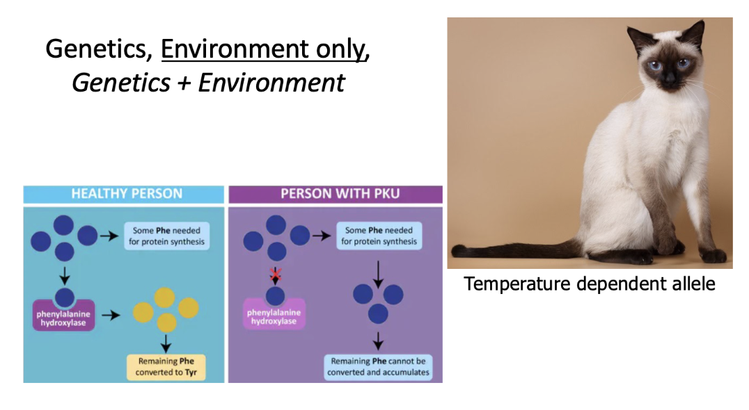 genetics + environment (ex. simese cats who have temperature dependent alleles in fur color)