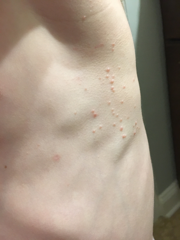 Fluid-filled blisters on torso, between fingers, hands, and feet -viral, self-limiting