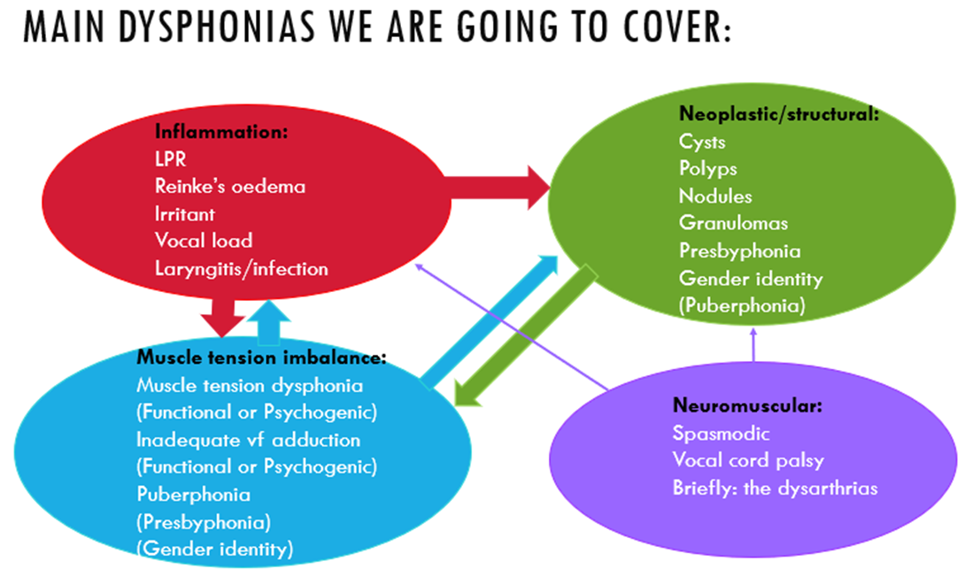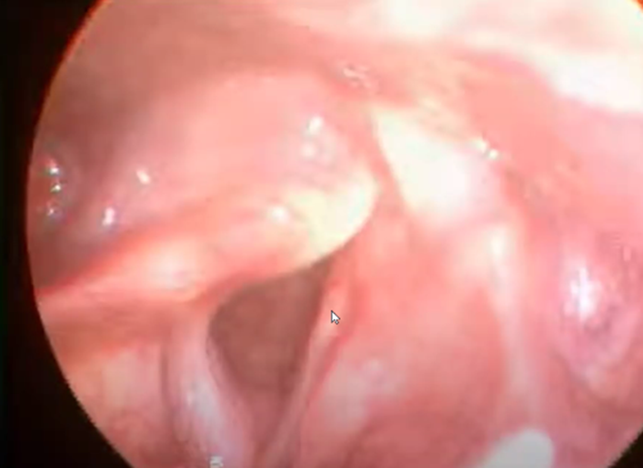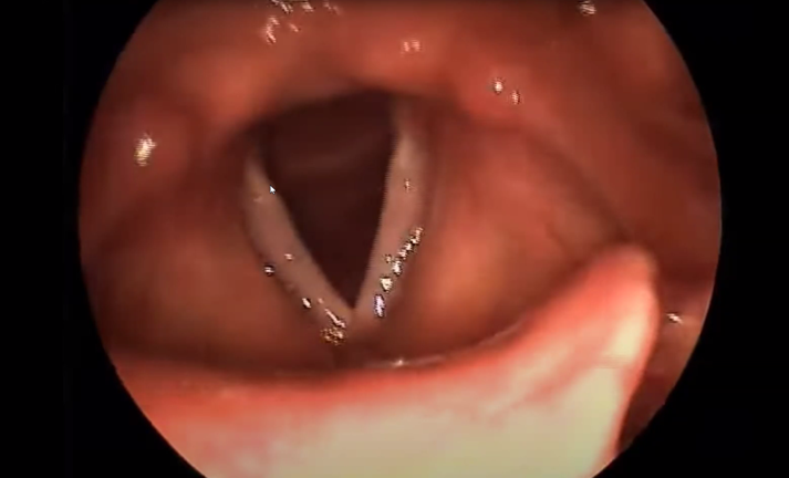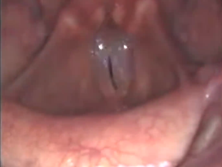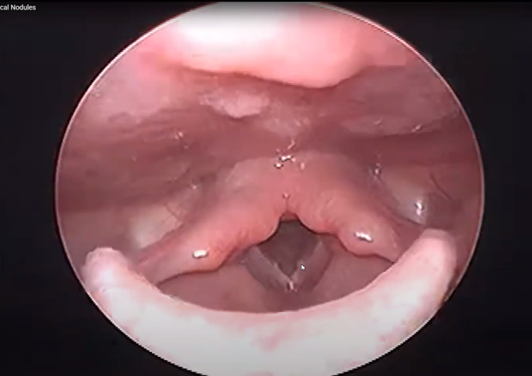 Muscle tension dysphonia – Too much muscle tension when voicing, you wont see a good view of vocal folds. Tissues are a bit pink or red so patient could report some soreness in throat. Arytenoids may look puffy. Not to be confused with supra glottic squeeze (compensatory muscle tension)