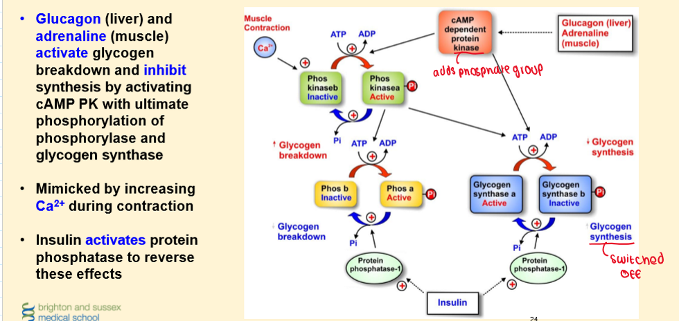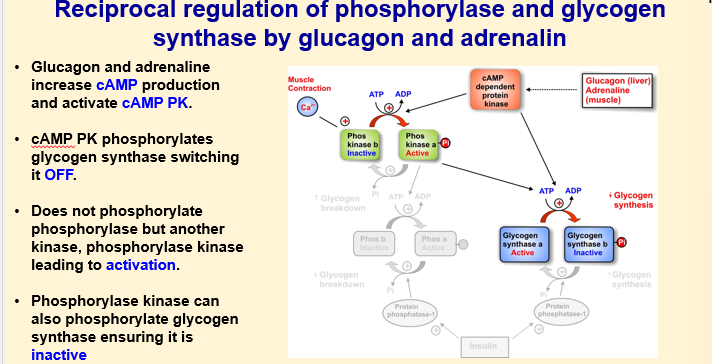 Decrease in glycogen synthesis and increase in glycogenolysis