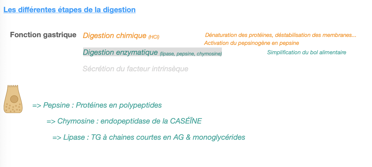 Digestion enzymatique : sécrétion d’enzymes gastriques (pepsine, lipase, chymosine).
