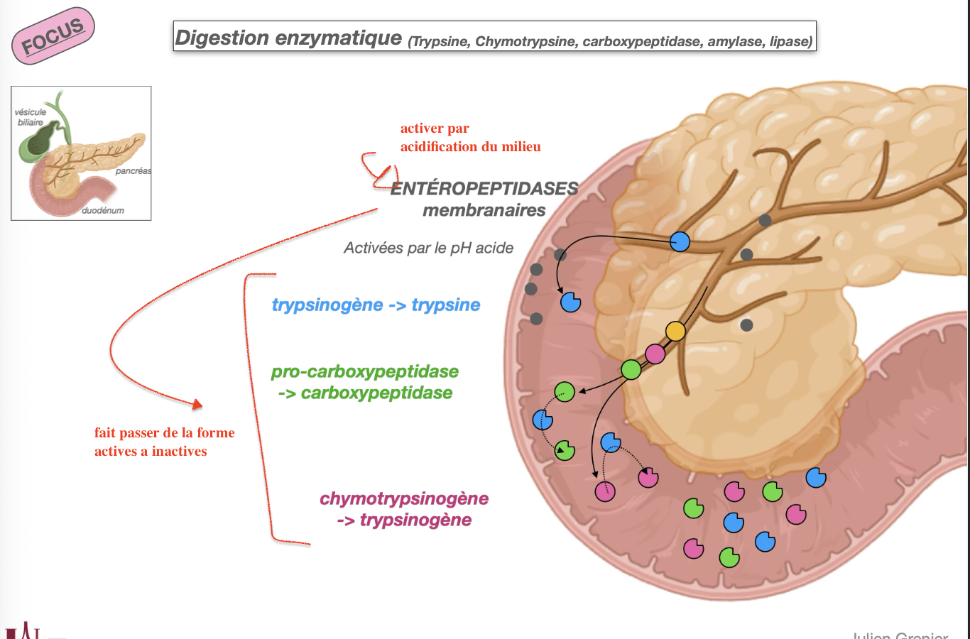 Activation : lorsque le chyme acide arrive dans le duodénum et ruisselle sur la muqueuse, il stimule et active les entéropeptidases.