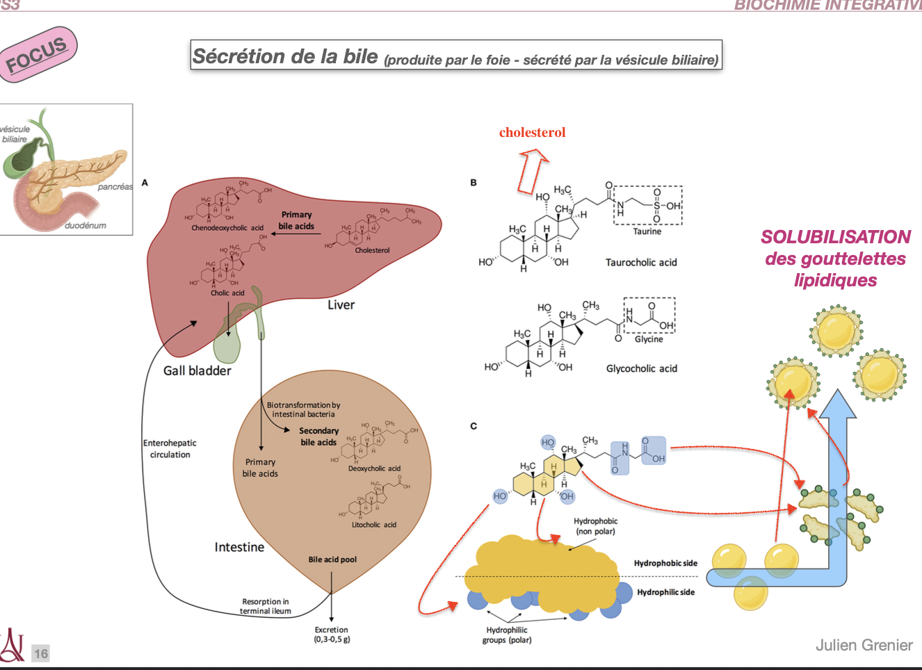 Quoi ? Emulsification des lipides alimentaires par les sels biliaires (dérivés amphiphiles du cholestérol, souvent conjugués à la glycine ou la taurine) et les phospholipides biliaires (ex. lécithine).