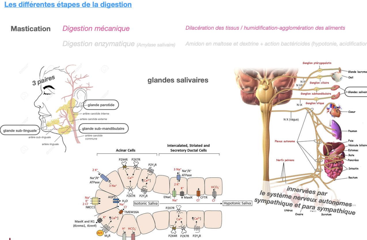 Quoi ? La mastication = digestion mécanique : dilacération des aliments + humidification/agglomération par la salive → formation du bol alimentaire. La digestion enzymatique buccale est assurée par l’amylase salivaire (ptyaline) qui commence l’hydrolyse des glucides.