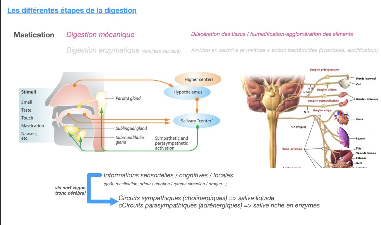 👉 Donc la digestion commence avant même la mise en bouche par la phase céphalique et la préparation des sécrétions digestives, déclenchées par le système nerveux autonome.